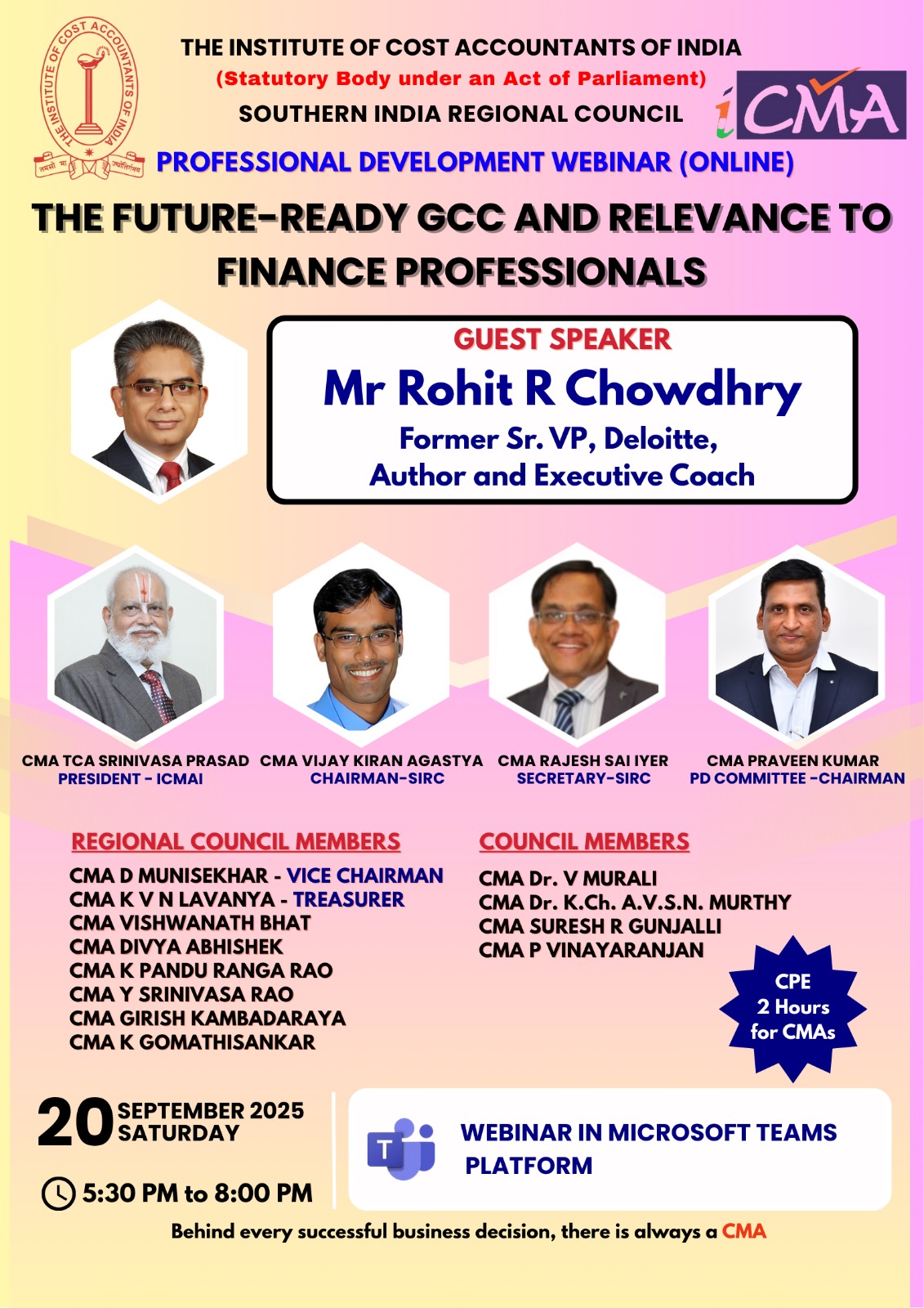 2025-09-20 | SIRC OF ICMAI - (ONLINE MODE) - PD WEBINAR (TODAY) "THE FUTURE-READY GCC AND RELEVANCE TO FINANCE PROFESSIONALS" - SATURDAY, 20th SEPTEMBER, 2025 - 5.30 PM TO 8.00 PM - Microsoft Teams Platform | View |