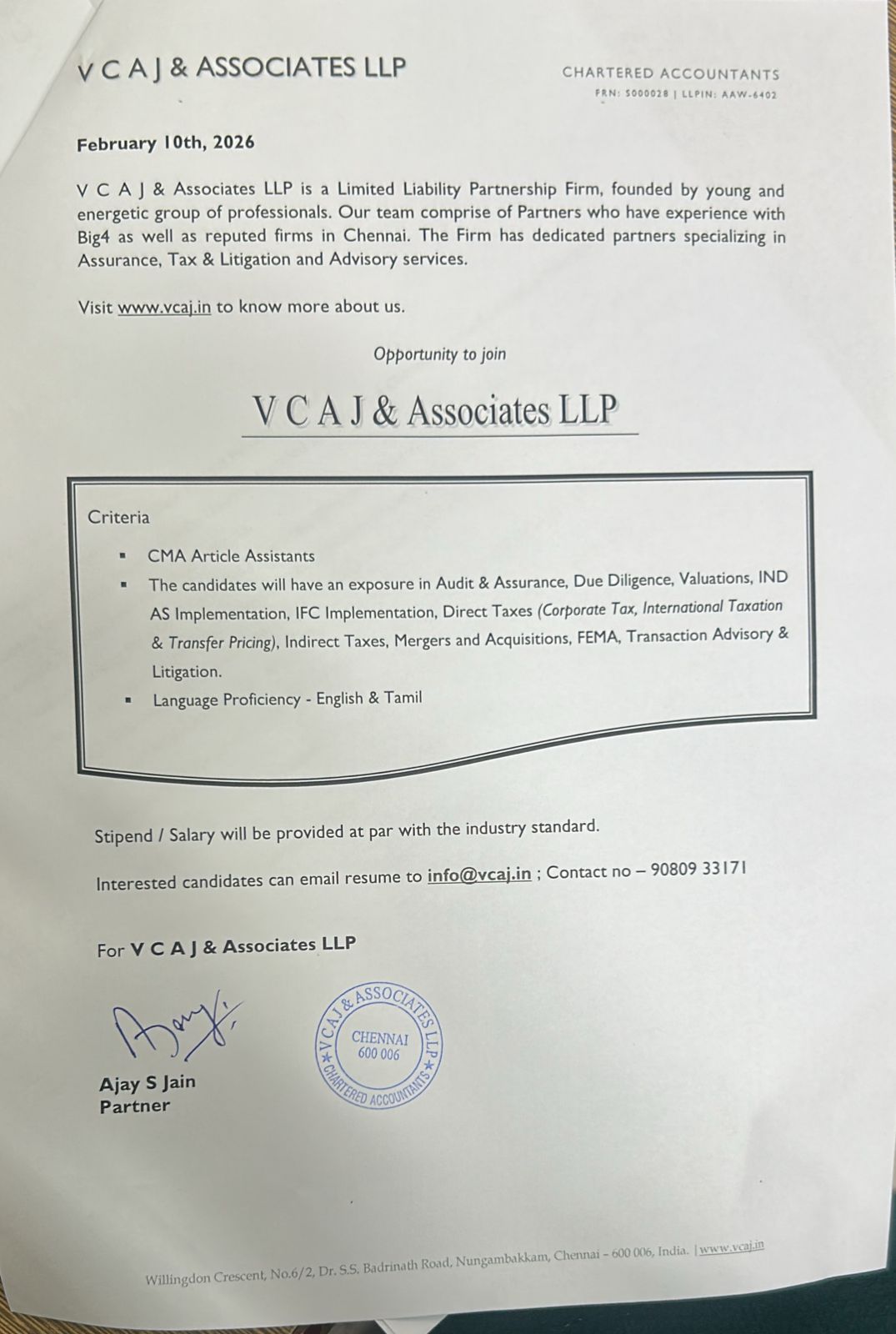 Vacancies for CMA Articled Assistants